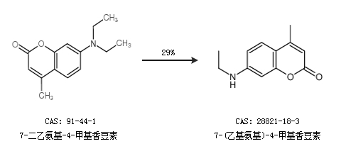 1.通过7-二乙氨基-4-甲基香豆素合成7-(乙基氨基)-4-甲基香豆素,收率约30%;