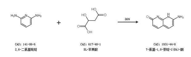 1.通过2,6-二氨基吡啶和DL-苹果酸合成7-氨基-1,8-萘啶-2(8h)-酮,收率约86%;
