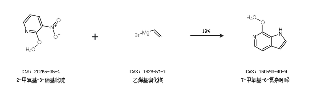 1.通过2-甲氧基-3-硝基吡啶和乙烯基溴化镁合成7-甲氧基-6-氮杂吲哚,收率约19%;