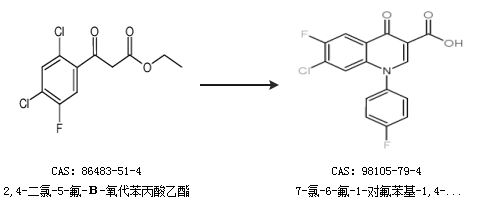 2.通过2,4-二氯-5-氟-Β-氧代苯丙酸乙酯合成7-氯-6-氟-1-对氟苯基-1,4-二氢-4-氧代-3-喹啉羧酸