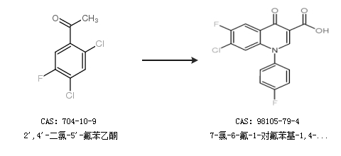 1.通过2'',4''-二氯-5''-氟苯乙酮合成7-氯-6-氟-1-对氟苯基-1,4-二氢-4-氧代-3-喹啉羧酸