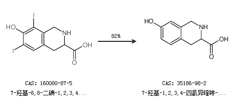 1.通过7-羟基-6,8-二碘-1,2,3,4-四氢异喹啉-3-羧酸合成7-羟基-1,2,3,4-四氢异喹啉-3-羧酸,收率约82%;