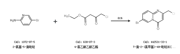 1.通过2-氨基-5-溴吡啶和4-氯乙酰乙酸乙酯合成7-溴-2-(氯甲基)-4H-吡啶并[1,2-a]嘧啶-4-酮,收率约81%;