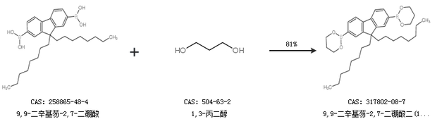 1.通过9,9-二辛基芴-2,7-二硼酸和1,3-丙二醇合成9,9-二辛基芴-2,7-二硼酸二(1,3-丙二醇)酯,收率约81%;