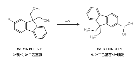 1.通过2-溴-9,9-二乙基芴合成9,9-二乙基芴-2-硼酸,收率约69%;