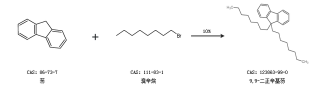 1.通过芴和溴辛烷合成9,9-二正辛基芴,收率约10%;