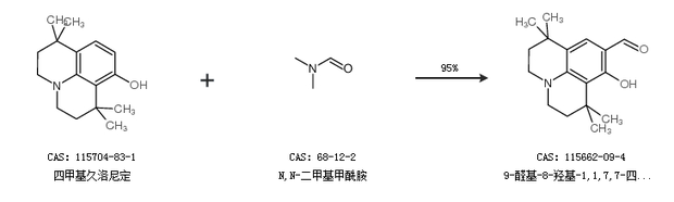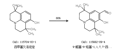 1.通过四甲基久洛尼定合成9-醛基-8-羟基-1,1,7,7-四甲基久洛尼定,收率约88%;