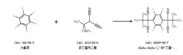 1.通过六氟苯和叔丁基丙二腈合成Alpha,Alpha-二-叔-丁基-Alpha,Alpha-二氰基-2,3,5,6-四氟-1,4-苯二乙酰腈