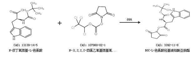 2.通过N-叔丁氧羰基-L-色氨酸和N-(1,2,2,2-四氯乙氧基羰基氧)琥珀酰亚胺合成BOC-L-色氨酸羟基琥珀酰亚胺酯,收率约89%;