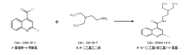 1.通过2-氯喹啉-4-甲酰氯和N,N-二乙基乙二胺合成N-(2-(二乙基)胺乙基)-2-氯基-4-喹啉甲酰胺