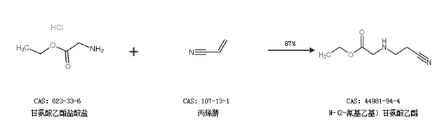 1.通过甘氨酸乙酯盐酸盐和丙烯腈合成N-(2-氰基乙基) 甘氨酸乙酯,收率约87%;