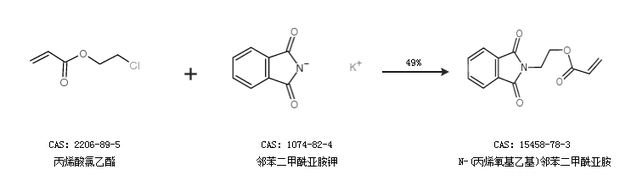 2.通过丙烯酸氯乙酯和邻苯二甲酰亚胺钾合成N-(丙烯氧基乙基)邻苯二甲酰亚胺,收率约49%;