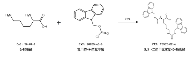 2.通过L-赖氨酸和氯甲酸-9-芴基甲酯合成N,N -二芴甲氧羰基-D-赖氨酸,收率约72%;