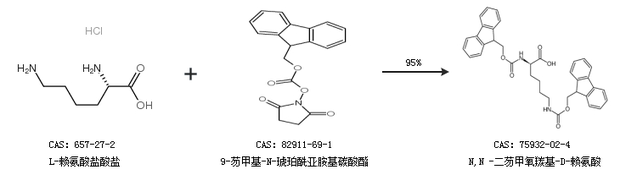 1.通过L-赖氨酸盐酸盐和9-芴甲基-N-琥珀酰亚胺基碳酸酯合成N,N -二芴甲氧羰基-D-赖氨酸,收率约95%;
