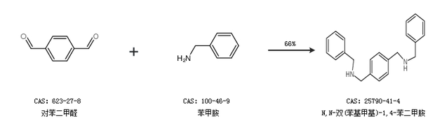 1.通过对苯二甲醛和苯甲胺合成N,N-双(苯基甲基)-1,4-苯二甲胺,收率约66%;