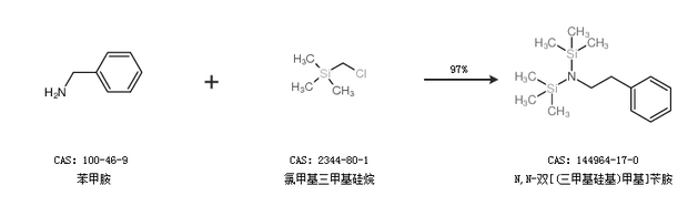 1.通过苯甲胺和氯甲基三甲基硅烷合成N,N-双[(三甲基硅基)甲基]苄胺,收率约97%;
