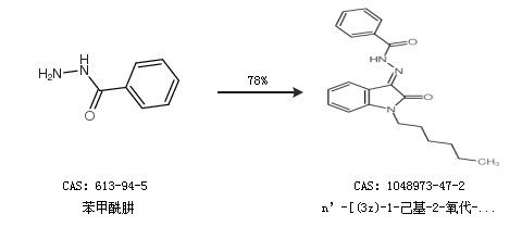 1.通过苯甲酰肼合成n’-[(3z)-1-己基-2-氧代-1,2-二氢-3H-吲哚-3-基idene]苯并肼,收率约78%;