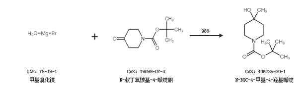 1.通过甲基溴化镁和N-叔丁氧羰基-4-哌啶酮合成N-BOC-4-甲基-4-羟基哌啶,收率约98%;