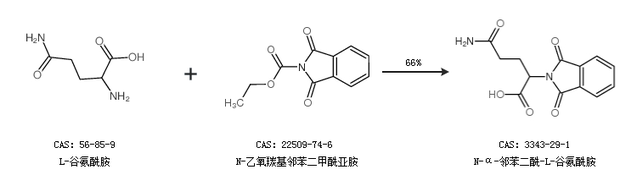 2.通过L-谷氨酰胺和N-乙氧羰基邻苯二甲酰亚胺合成N-α-邻苯二酰-L-谷氨酰胺,收率约66%;