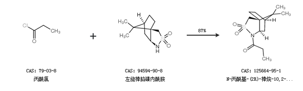 1.通过丙酰氯和左旋樟脑磺内酰胺合成N-丙酰基-(2R)-樟烷-10,2-磺内酰胺,收率约87%;