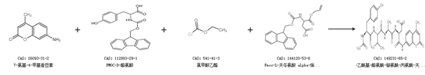 1.通过7-氨基-4-甲基香豆素、FMOC-D-酪氨酸、氯甲酸乙酯和Fmoc-L-天冬氨酸 alpha-烯丙酯合成N-乙酰基-酪氨酰-缬氨酰-丙氨酰-天冬氨酸-7-氨基-4-甲基香豆素