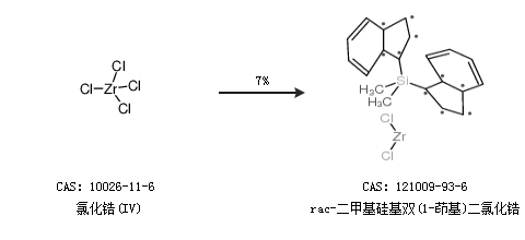 1.通过氯化锆(IV)合成rac-二甲基硅基双(1-茚基)二氯化锆,收率约7%;