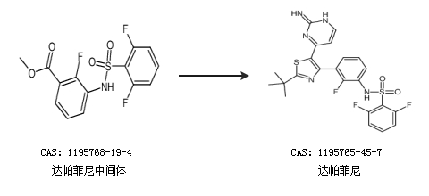 英文别名 Dabrafenib [USAN:INN];N-[3-[5-(2-aminopyrimidin-4-yl)-2-tert-butyl-1,3-thiazol-4-yl]-2-fluorophenyl]-2,6-difluorobenzenesulfonamide;UNII-QGP4HA4G1B;Tafinlar;Dabrafenib (USAN);Dabrafenib;N-{3-[5-(2-amino-4-pyrimidinyl)-2-(1,1-dimethylethyl)-1,3-thiazol-4-yl]-2-fluorophenyl}-2,6-difluorobenzene sulfonamide;