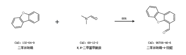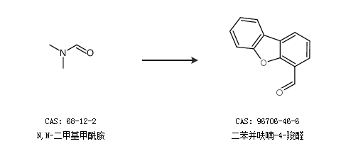 1.通过二苯并呋喃和N,N-二甲基甲酰胺合成二苯并呋喃-4-羧醛,收率约88%;