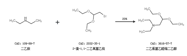 1.通过二乙胺和2-溴-1,1-二乙氧基乙烷合成二乙氨基乙醛缩二乙醇,收率约20%;