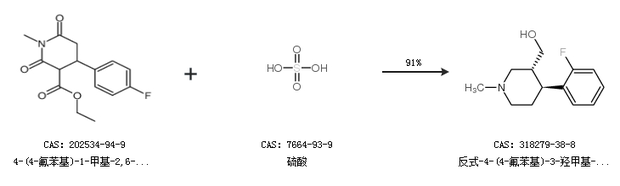 1.通过4-(4-氟苯基)-1-甲基-2,6-二氧代哌啶-3-羧酸乙酯和硫酸合成反式-4-(4-氟苯基)-3-羟甲基-1-甲基哌啶,收率约91%;