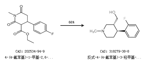 2.通过4-(4-氟苯基)-1-甲基-2,6-二氧代哌啶-3-羧酸乙酯合成反式-4-(4-氟苯基)-3-羟甲基-1-甲基哌啶,收率约66%;