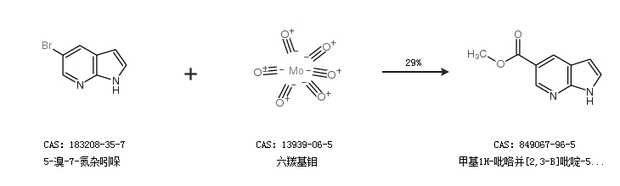 2.通过5-溴-7-氮杂吲哚和六羰基钼合成甲基1H-吡咯并[2,3-B]吡啶-5-甲酸酯,收率约29%;