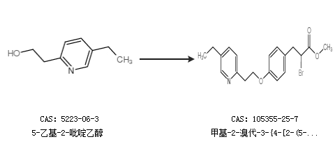 英文别名 pioglitazone bromo ether;methyl 2-bromo-3-(4-(2-(5-ethylpyridin-2-yl)ethoxy)phenyl)propanoate;methyl 2-bromo-3-{4-[2-(5-ethyl-pyridin-2-yl)ethoxy]phenyl}propionate;2-bromo-3-(4-(2-(5-ethyl-2-pyridyl)ethoxy)phenyl)propionic acid methyl ester;Methyl 2-bromo-3-[4-[2-(5-ethyl-2-pyridyl)ethoxy]phenyl]propionate;