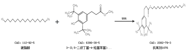 1.通过硬脂醇和3-(3,5-二叔丁基-4-羟基苯基)丙酸甲酯合成抗氧剂1076,收率约99%;