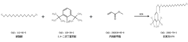 2.通过硬脂醇、2,6-二叔丁基苯酚和丙烯酸甲酯合成抗氧剂1076,收率约82%;