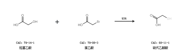 1.通过羟基乙酸和溴乙酸合成硫代乙醇酸,收率约93%;