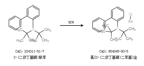 1.通过2-(二叔丁基膦)联苯合成氯[2-(二叔丁基磷)二苯基]金,收率约10%;
