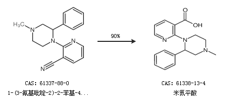 1.通过1-(3-氰基吡啶-2)-2-苯基-4-甲基哌嗪合成米氮平酸,收率约90%;