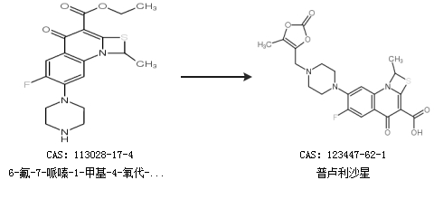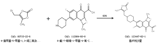 1.通过4-溴甲基-5-甲基-1,3-间二氧杂环戊烯-2-酮和6-氟-7-哌嗪-1-甲基-4-氧-[1,3]硫氮杂环[3,2-a]-喹啉-3-羧酸合成普卢利沙星,收率约60%;