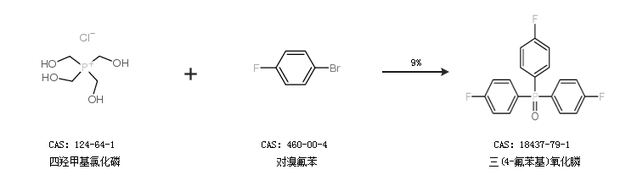 1.通过四羟甲基氯化磷和对溴氟苯合成三(4-氟苯基)氧化膦,收率约9%;