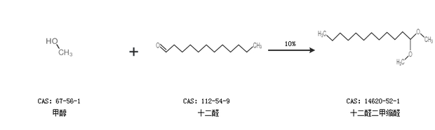 1.通过甲醇和十二醛合成十二醛二甲缩醛,收率约10%;