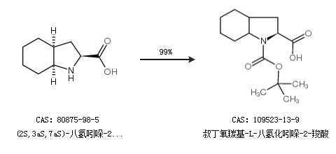 1.通过(2S,3aS,7aS)-八氢吲哚-2-羧酸合成叔丁氧羰基-L-八氢化吲哚-2-羧酸,收率约99%;
