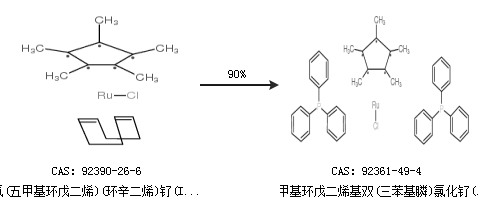 2.通过氯(五甲基环戊二烯)(环辛二烯)钌(II)合成五甲基环戊二烯基双(三苯基膦)氯化钌(II),收率约90%;