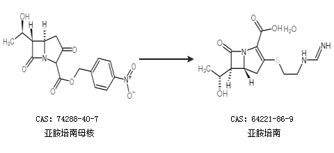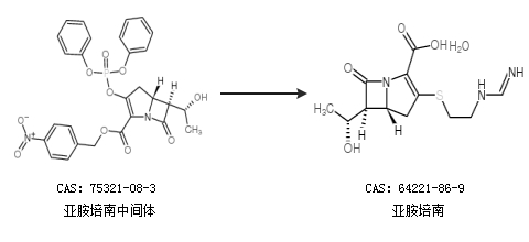 中文别名 6-(1-羟基乙基)-3-[[2-[(亚氨基甲基)氨基]乙基]硫]-7-氧代-1-氮杂双环[3.2.0]庚-2-烯-2-甲酸;亚安培南;(5R,6S)-6-[(1R)-1-羟乙基]-3-[[2-[(亚氨基甲基)氨基]乙基]硫代]-7-氧代-1-氮杂双环[3.2.0]庚-2-烯-2-羧酸单水合物;