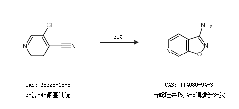 2.通过3-氯-4-氰基吡啶合成异噁唑并[5,4-c]吡啶-3-胺,收率约39%;