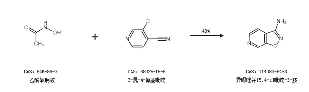 1.通过乙酰氧肟酸和3-氯-4-氰基吡啶合成异噁唑并[5,4-c]吡啶-3-胺,收率约40%;