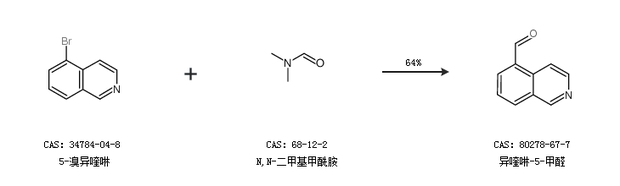 1.通过5-溴异喹啉和N,N-二甲基甲酰胺合成异喹啉-5-甲醛,收率约64%;