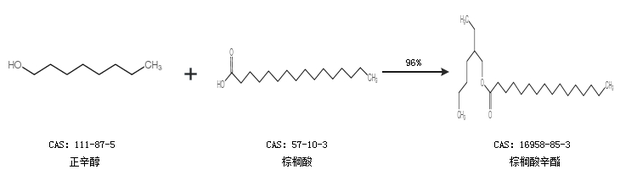 1.通过正辛醇和棕榈酸合成棕榈酸辛酯,收率约96%;