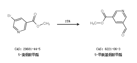 1.通过5-溴烟酸甲酯合成5-甲酰基烟酸甲酯,收率约15%;