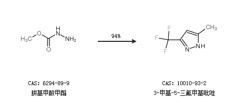 2.通过肼基甲酸甲酯合成3-甲基-5-三氟甲基吡唑,收率约94%;